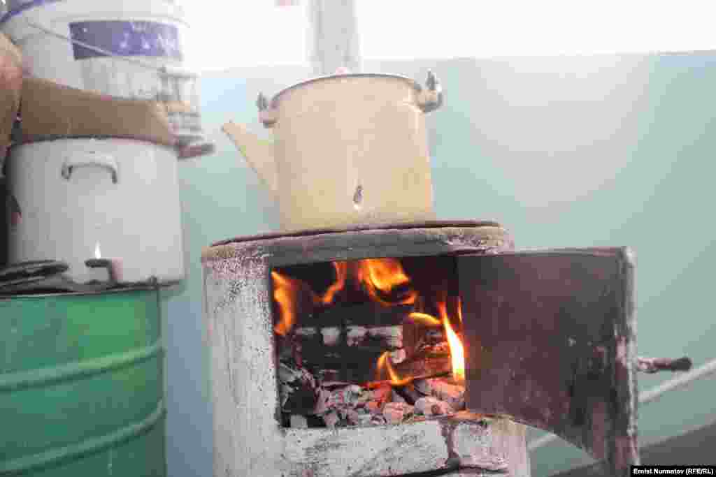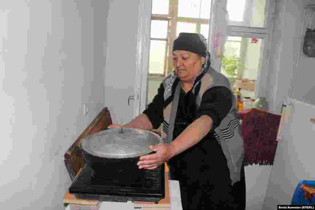Жительница Оша Ирсолат Исмаилова готовит обед для внуков на печке, которую установила прямо на балконе четырехэтажного дома