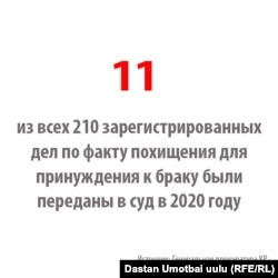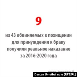 Журналисты «Клоопа» и «Азаттыка» проанализировали данные и выяснили, что статья о похищении женщин для принудительного вступления в брак практически не работает. Это означает, что ужесточение наказания просто ни к чему не ведет и ни на что не влияет.